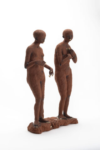 Claire’s ceramic sculptures explore the uncertain space between the earthly and the ethereal. Working in porcelain, terracotta, and stoneware, her figures are made from the raw earth, formed by hand and brought into a state of being where they hover on the brink of consciousness. A head lies with its lips touching a golden pool; a pair of terracotta figures stand side by side fresh-formed, their lips and fingers tipped in the same gold as if having had their first taste of a greater existence. This sense of magic and mythological animism runs like a golden thread through Claire’s sculptures.