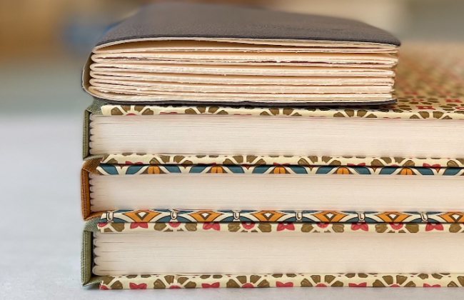 Drawing inspiration from the natural beauty of paper, linen and leather, Megan aims to make books that feel calm and subtle, brought to life by areas of colour, pattern or texture. The tactile nature of a book is also important to her; there is something so magical about the feel of a book in your hands and the movement of the turning pages. Megan’s books are above all practical- made to be used and to last.